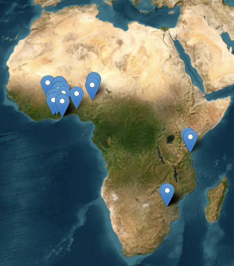 Mosquitoes were collected from 17 locations across Ghana; 4 locations across Nigeria; 2 locations across Tanzania; 1 location in Burkina Faso and 1 location in Zimbabwe.